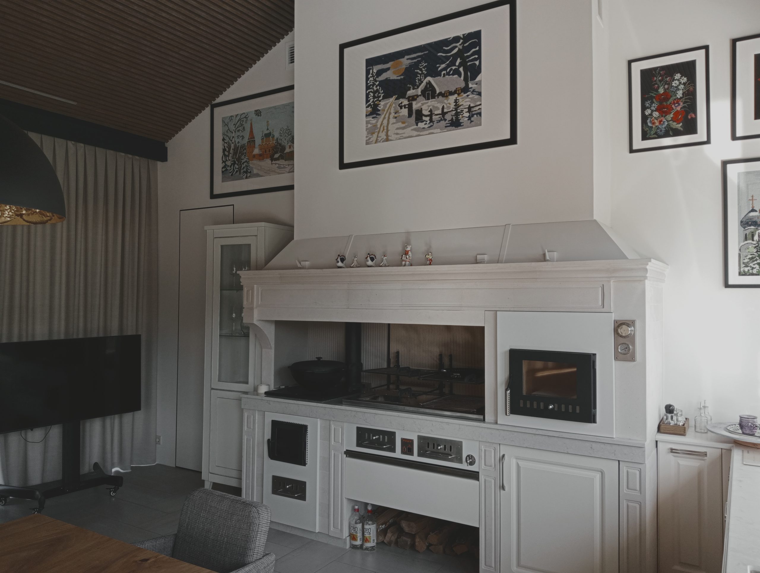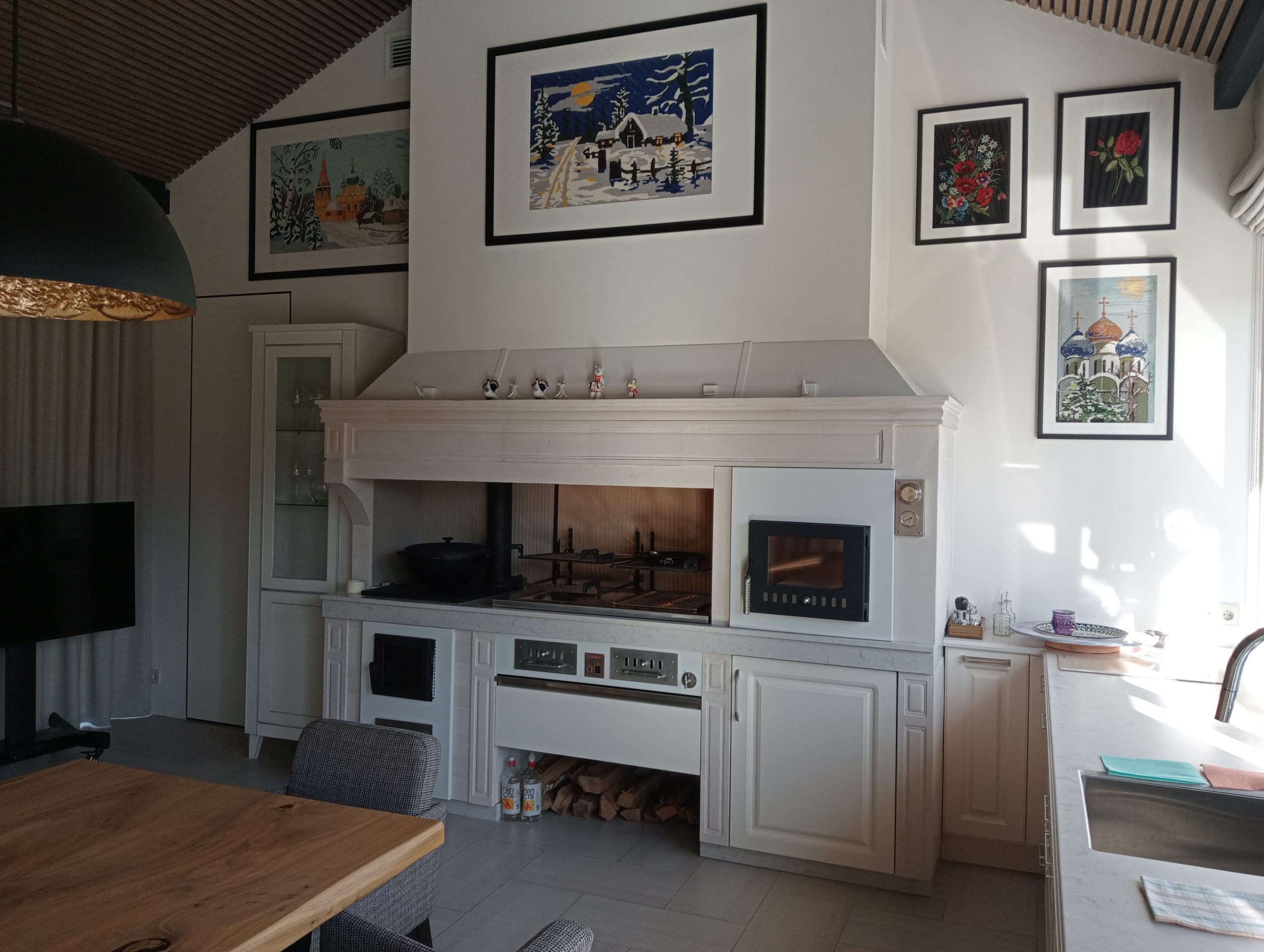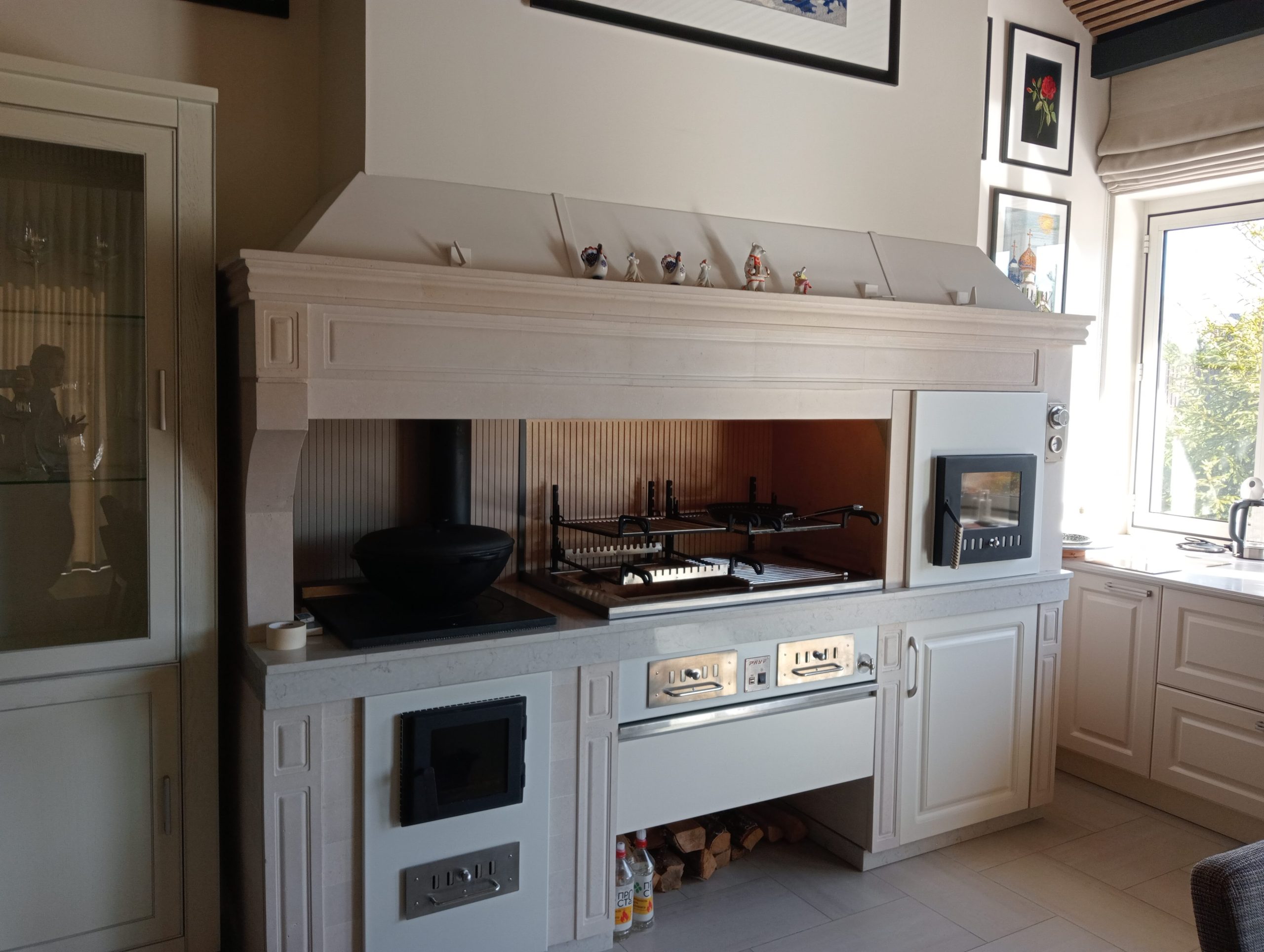 Очаг искусно облицован благородным белым известняком, а рабочая поверхность столешницы выполнена из премиального кварцевого агломерата Radianz, гарантирующего долговечность и безупречный внешний вид.