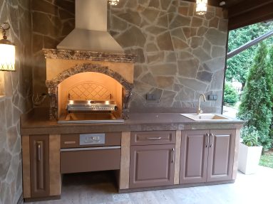 Представляем современное барбекю из камня для дачи в стиле Прованс. Оптимальная комплектация: мангал и рабочая зона с мойкой, и красивая отделка, облицовка Дача. Комплекс расположен на открытой террасе около бани.