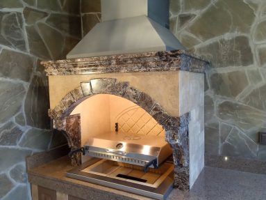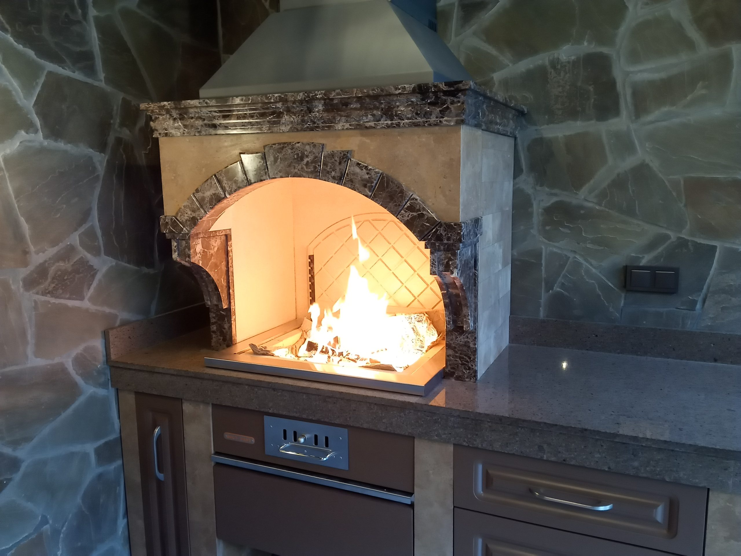 В отделке использованы травертин Ноче и мрамор Имперадор Дарк для облицовки, Дымовский гранит для столешницы и влагостойкая мебельная фанера для фасадов шкафчиков.