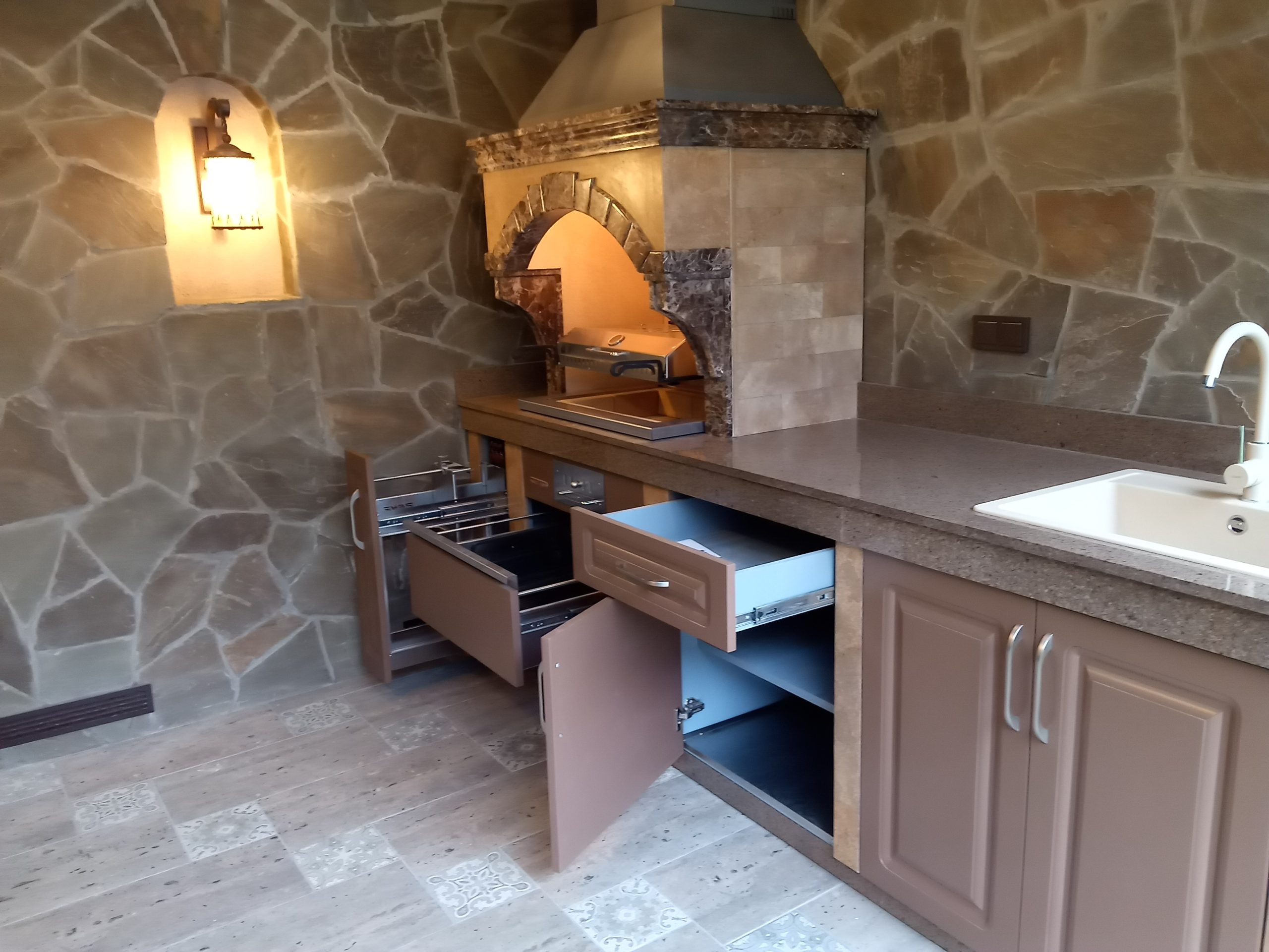 В представленном комплексе есть все необходимое: мангал 75см с удобной рабочей зоной справа позволит готовить одновременно несколько блюд. А чтобы всё необходимое было под рукой, предусмотрены зоны хранения – шкафчики и выдвижные ящики. Просторная рабочая поверхность и практичная гранитная мойка делают процесс приготовления максимально комфортным.