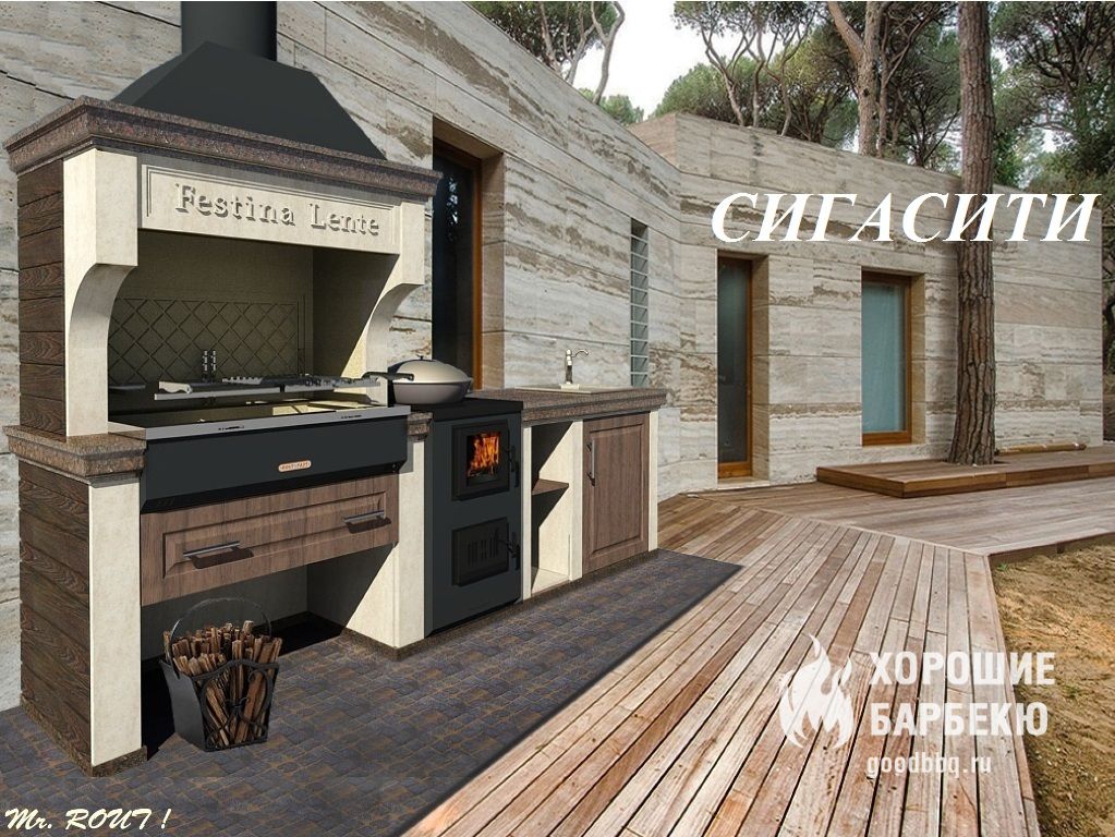 Количество же сочетаний основных элементов гриля РАУТ — мангал, печь под казан,шкафы различных размеров, с дверками и открытые, выдвижные ящики и пр. — не ограничено. Плюс еще и зеркальные варианты…