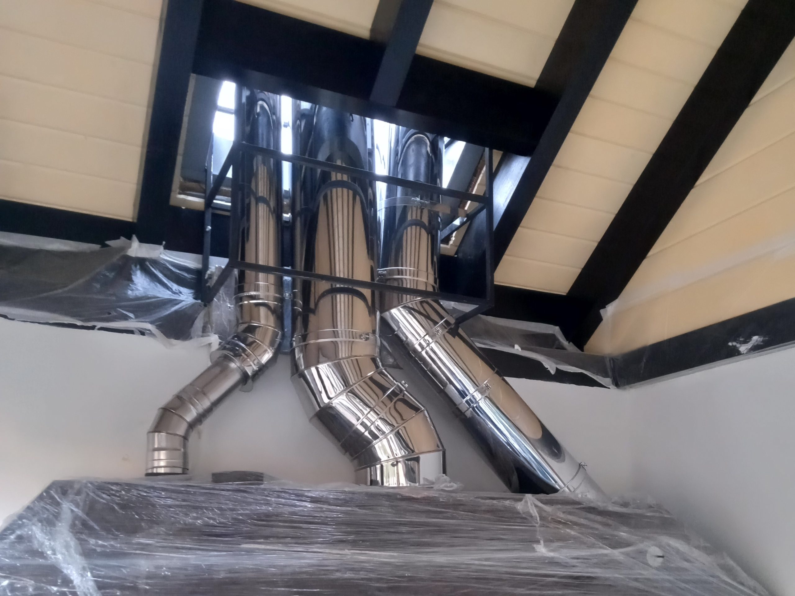 Сложная дымоходная система закрыта декоративным коробом из металла. Над крышей дымоход также закрыт коробом из металла.