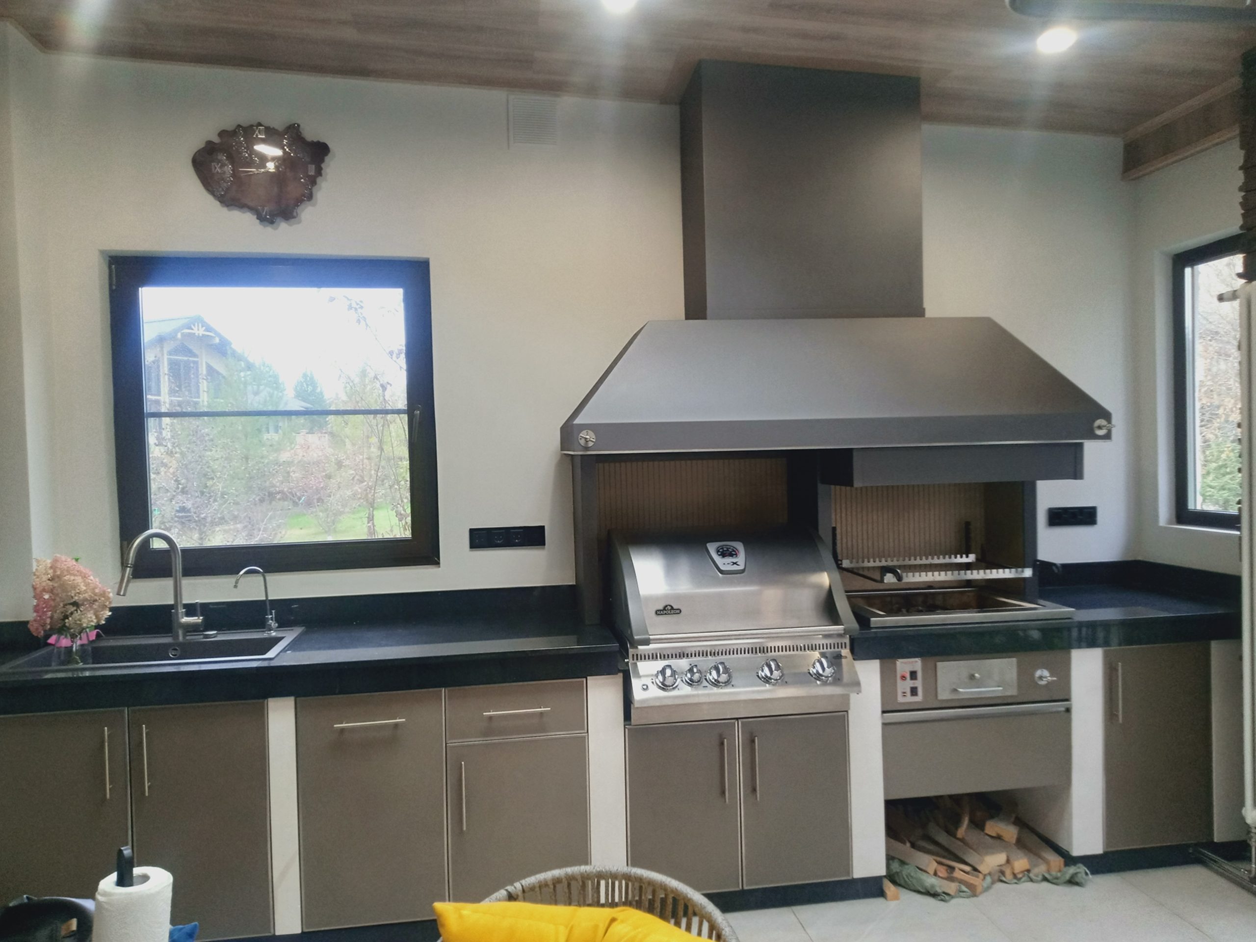 Поэтому для больших домов считаем необходимым установку вентилятора-дымососа. Но только нужно правильно рассчитать его производительность. А также не забыть организовать приток необходимого объема воздуха в помещение с комплексом барбекю.